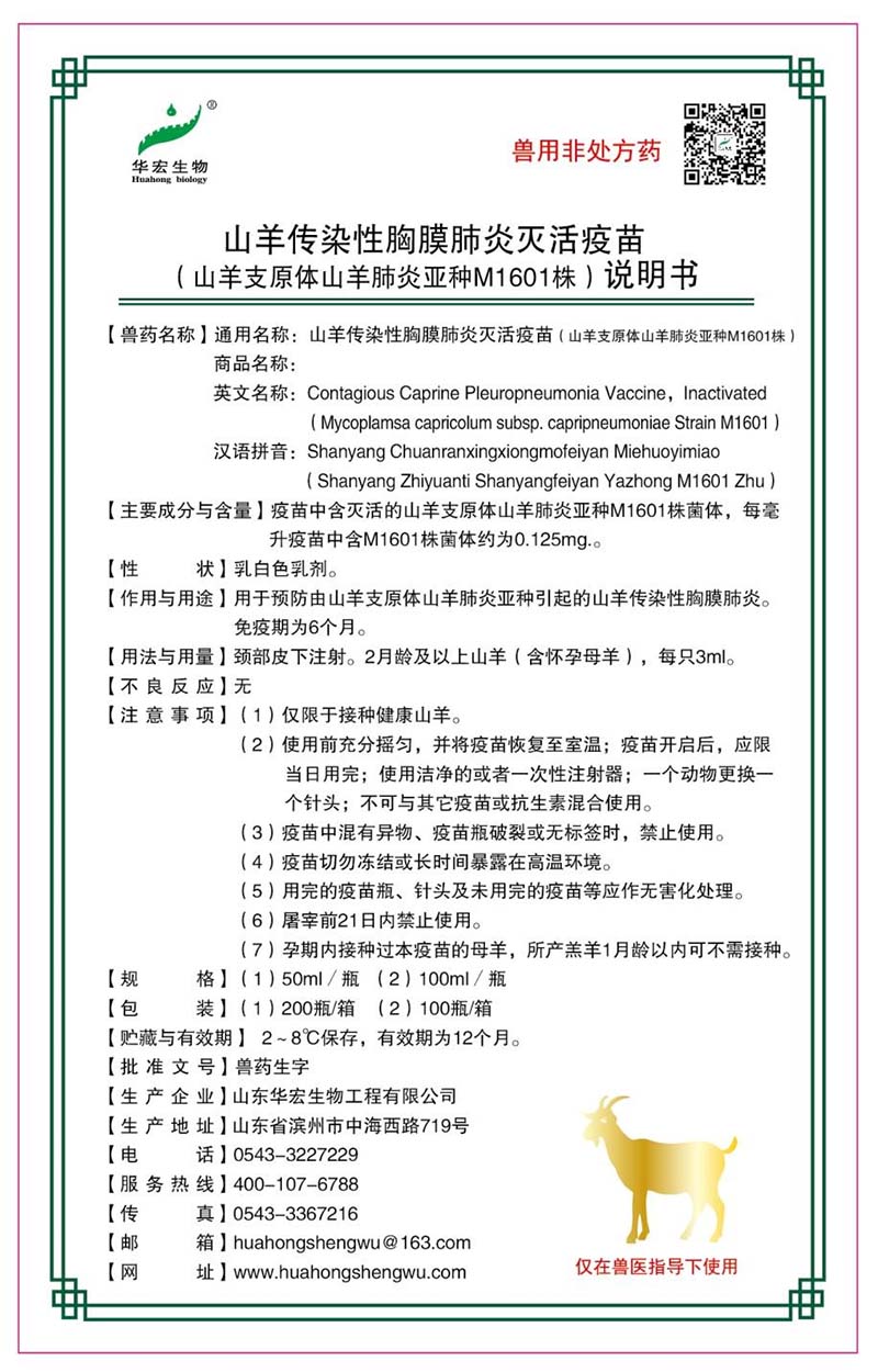 作用與用途:用于預(yù)防由山羊支原體山羊肺炎亞種引起的山羊傳染性胸膜肺炎